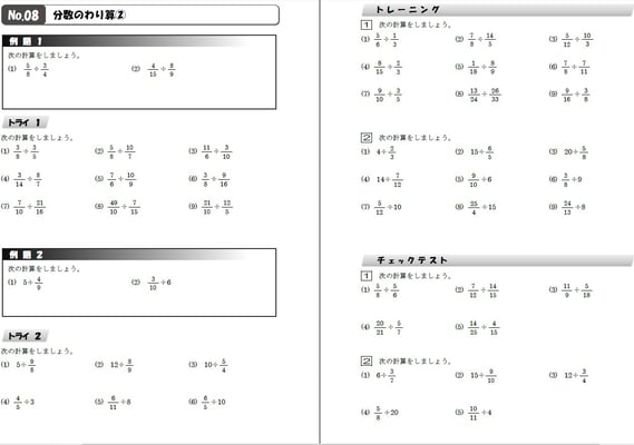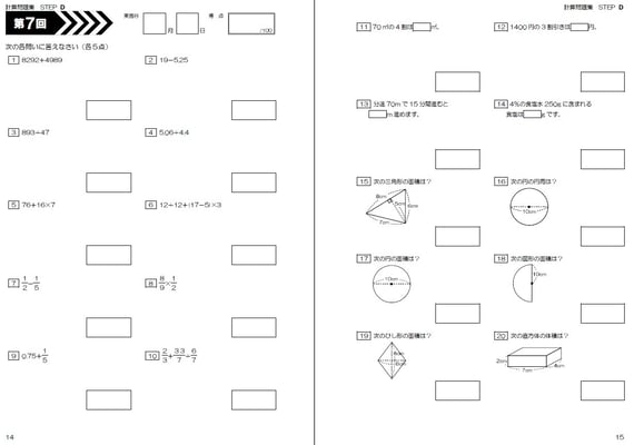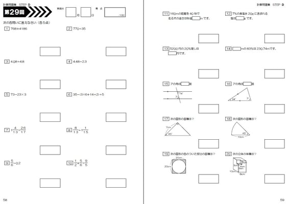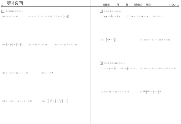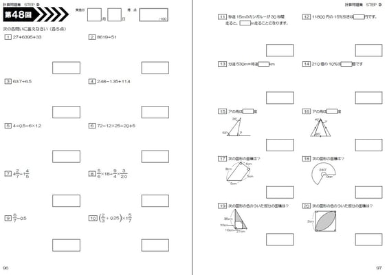 該当学年までに学習した計算問題が1回あたり20問、全50回分で1冊です。各学年2冊ずつ使用する構成。基準は1週間で2回です。数学の実力をつけるための、究極の問題集だと自負しております。計算問題だけでなく、%や速さの短文章問題も出てきます。